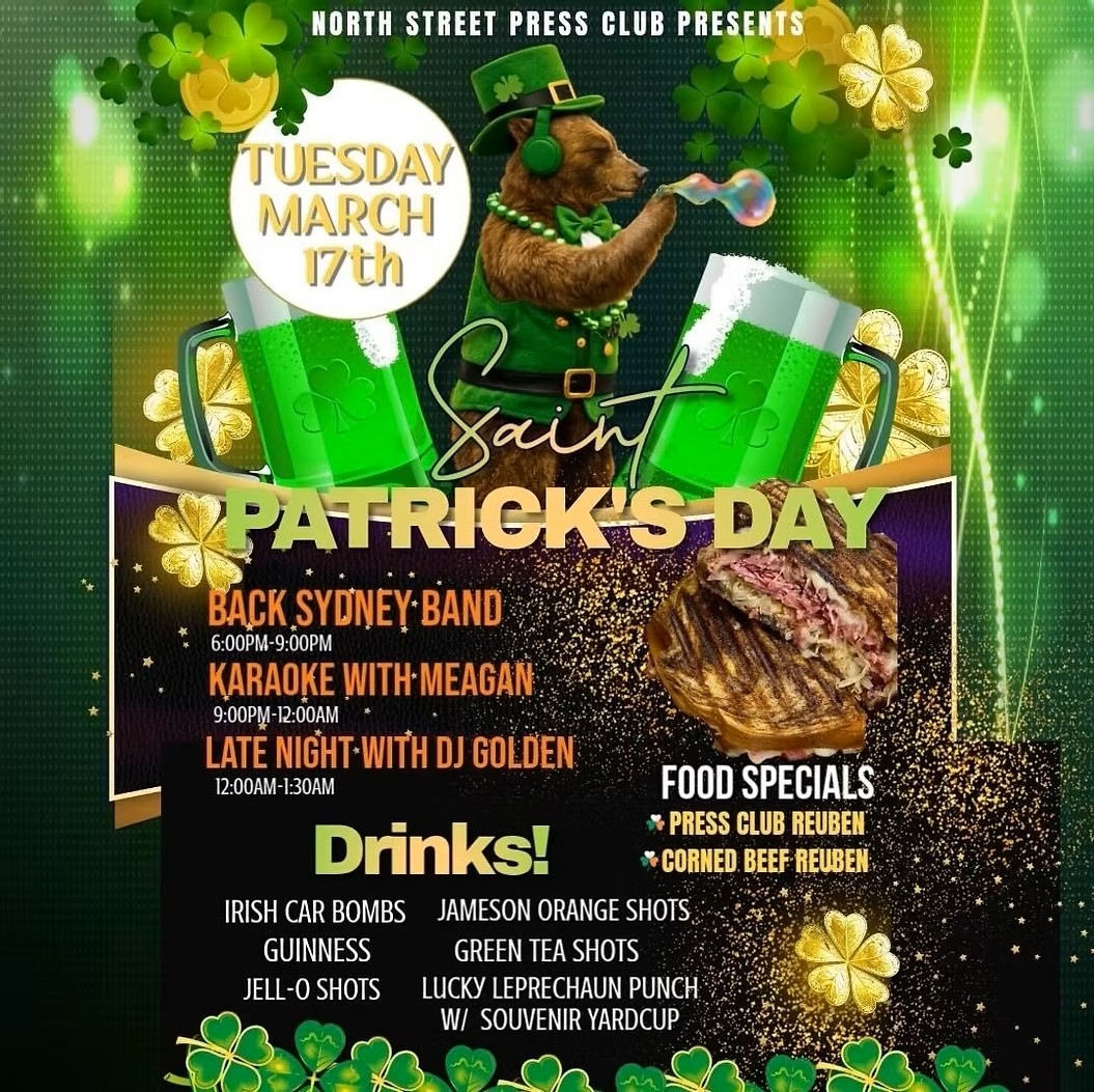 Join us for St. Patrick’s Day at North Street Press Club for a live band, karaoke, and a late night DJ. Food and Drink deals included!